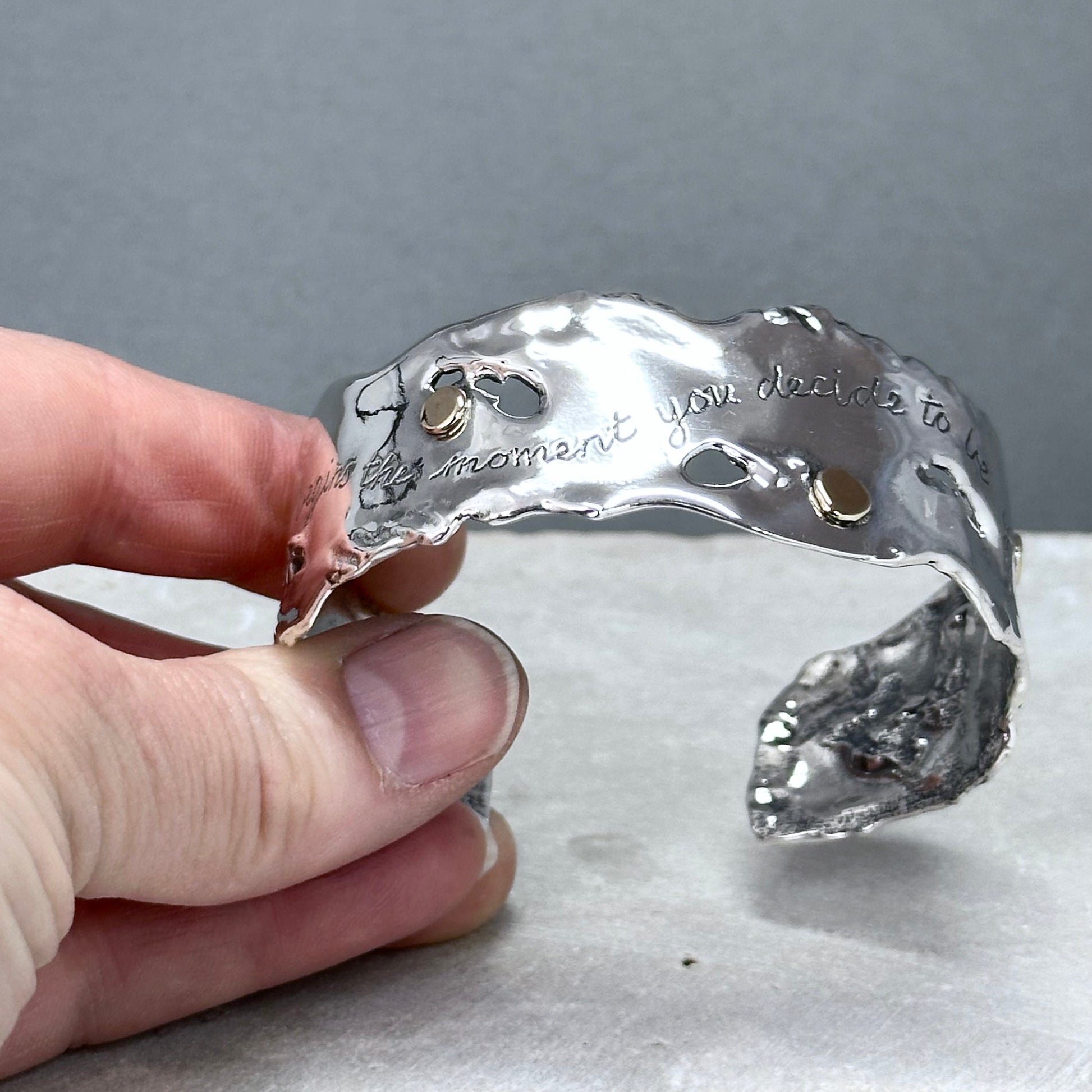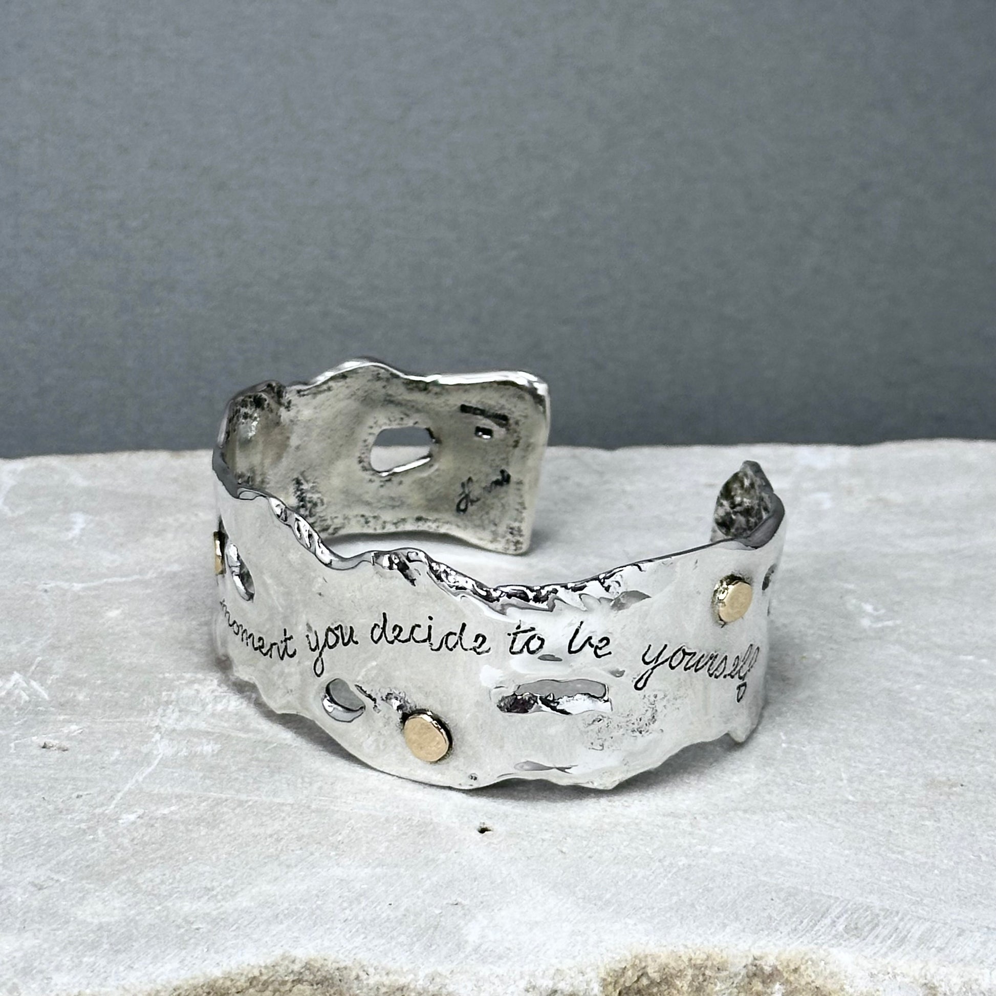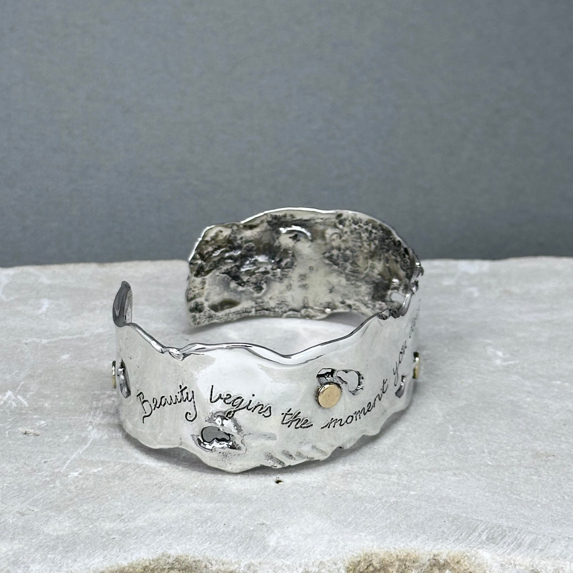 "Beauty" ~ Sterling silver sculptural cuff bracelet with four 14kt gold dots randomly placed around the cuff, and the words, "Beauty begins the moment you decide to be yourself" hand inscribed in script on the front of the cuff. My Flowing Water series of sculptural jewelry is one of my favorite things to make, and I love this piece!