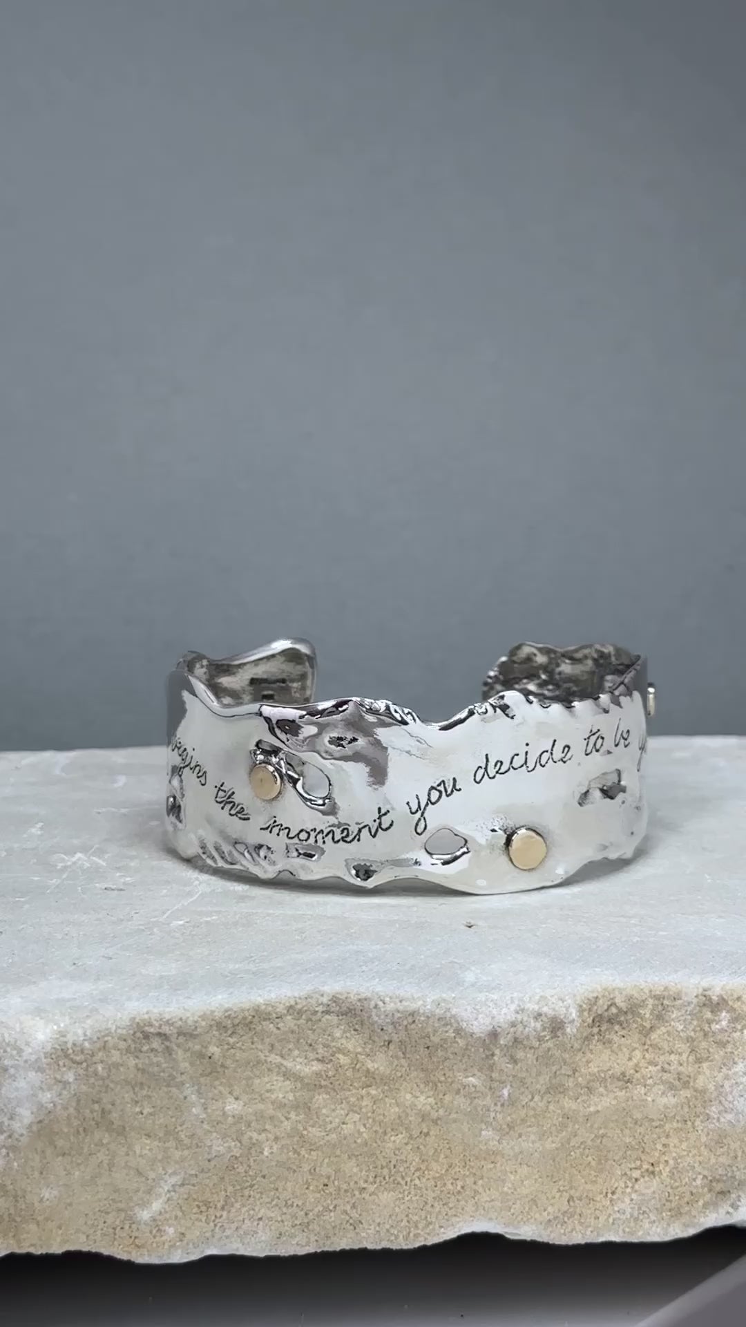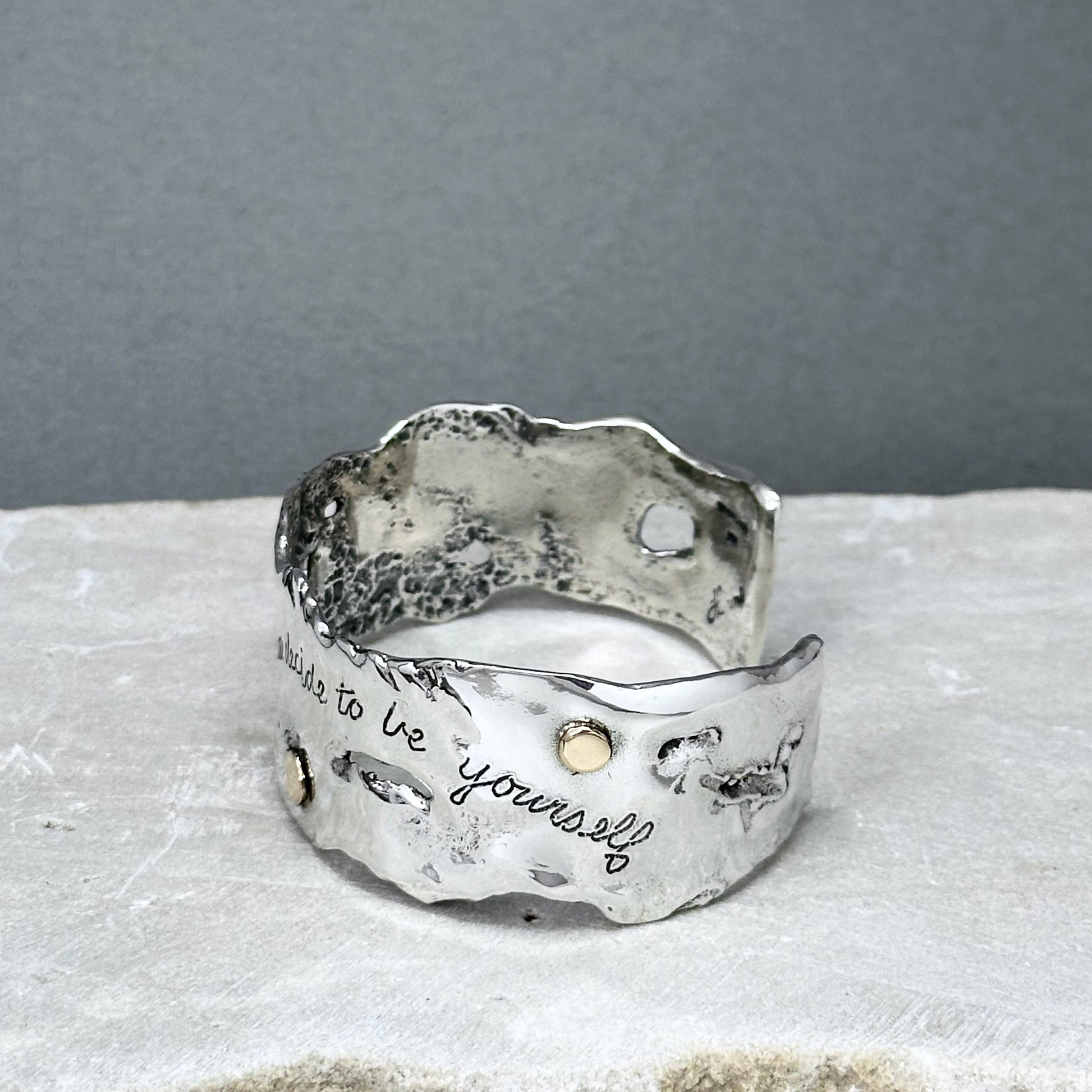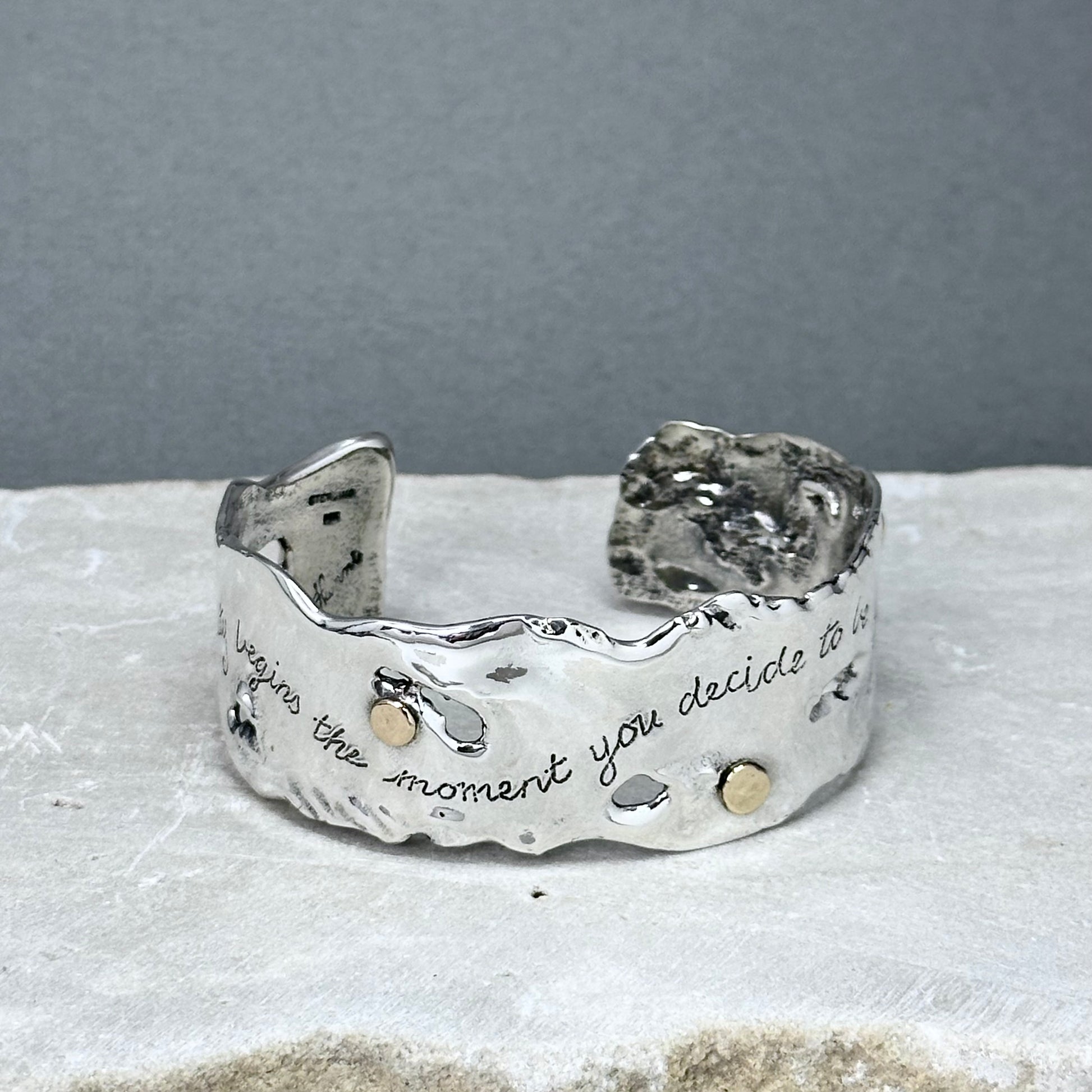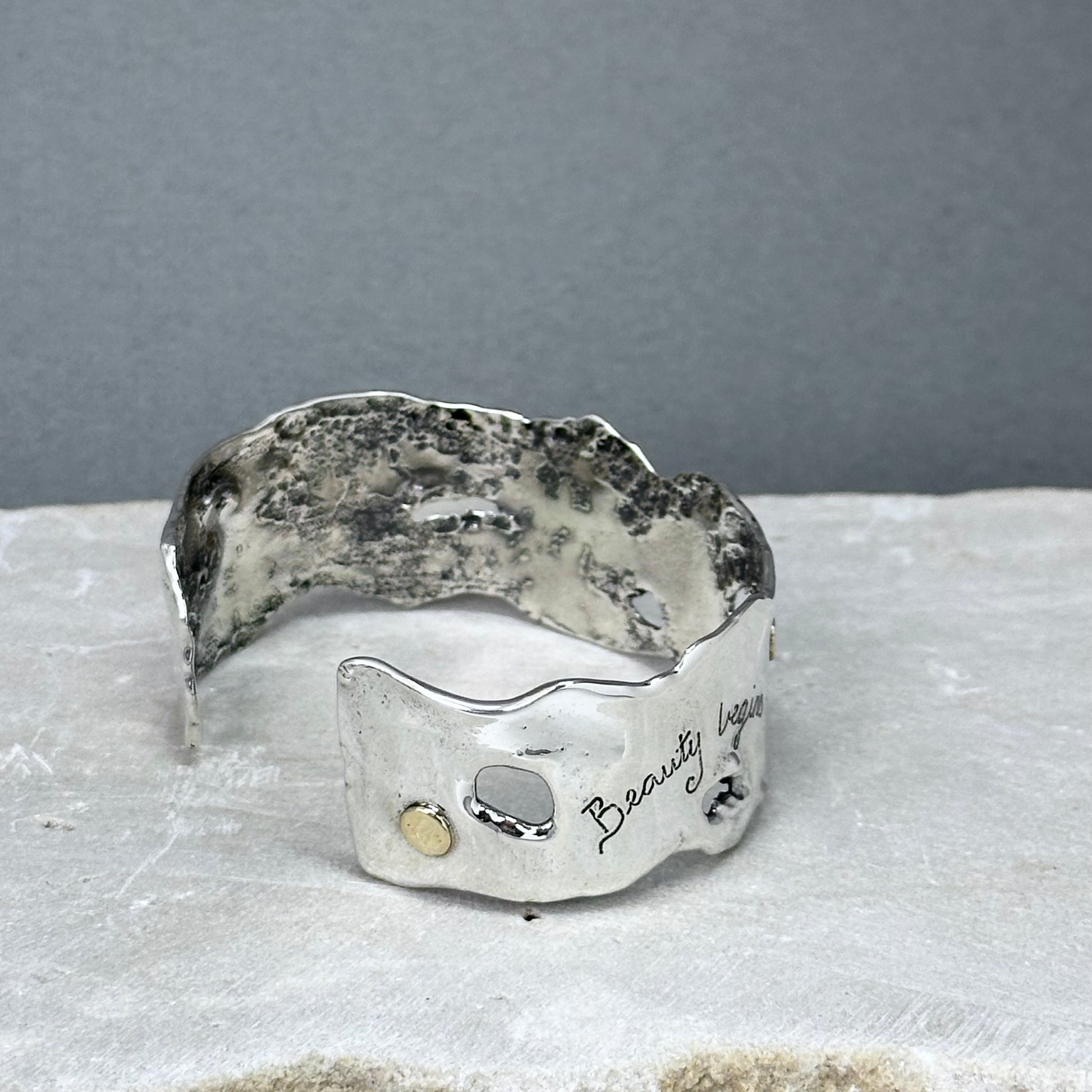 "Beauty" ~ Sterling silver sculptural cuff bracelet with four 14kt gold dots randomly placed around the cuff, and the words, "Beauty begins the moment you decide to be yourself" hand inscribed in script on the front of the cuff. My Flowing Water series of sculptural jewelry is one of my favorite things to make, and I love this piece!