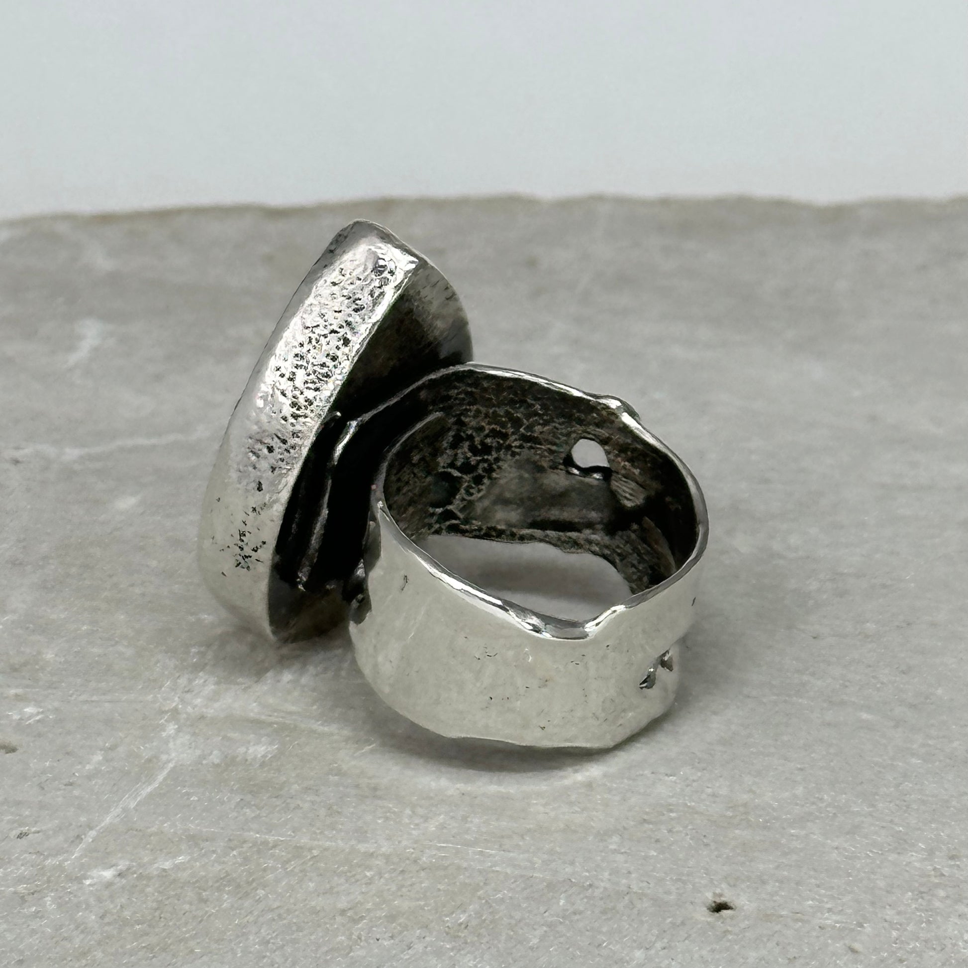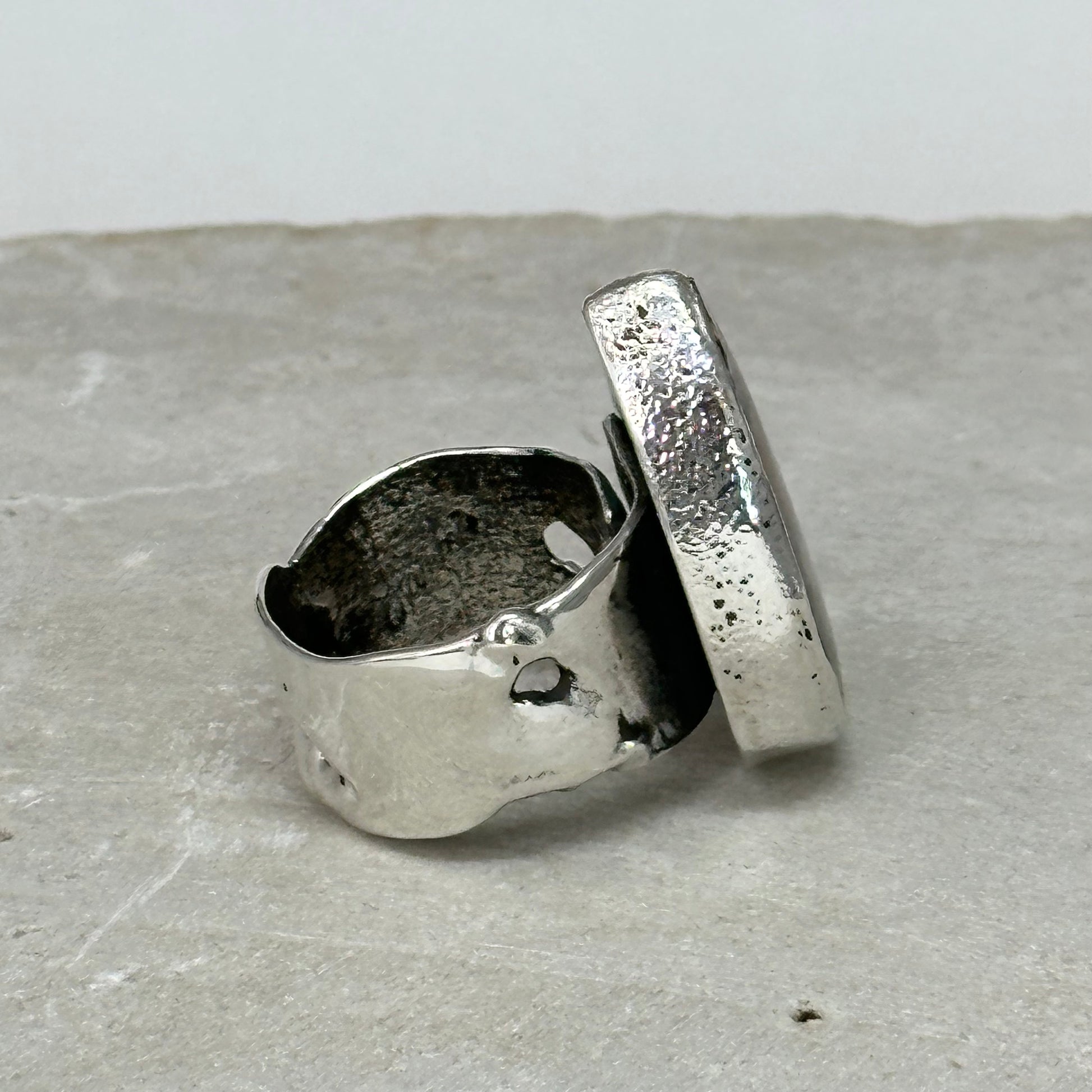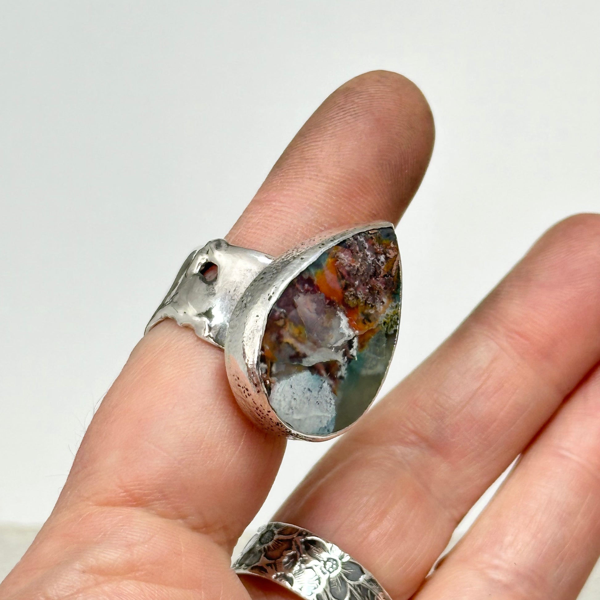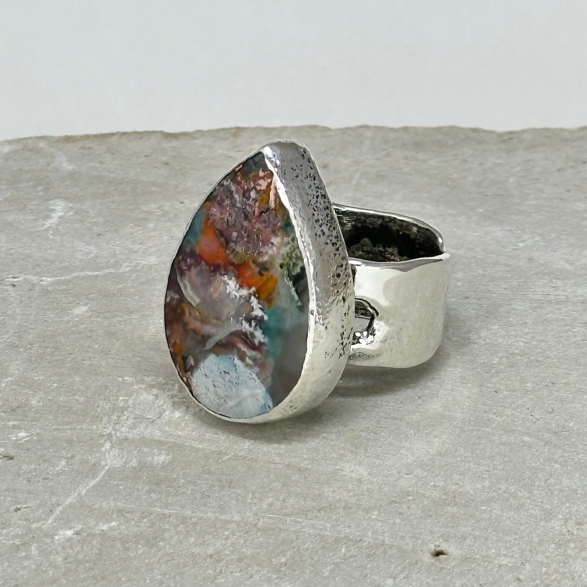 Made of Argentium (tarnish resistant) silver, fine silver and copper moss agate. Adjustable - best for a size 6-10 (size up a bit as the band is wide). Please give me your size and I'll size it before shipping.