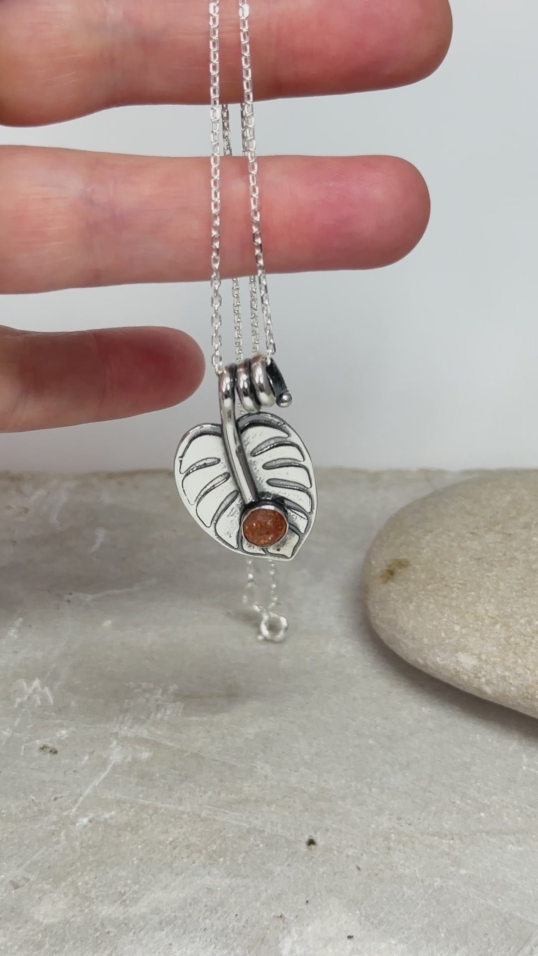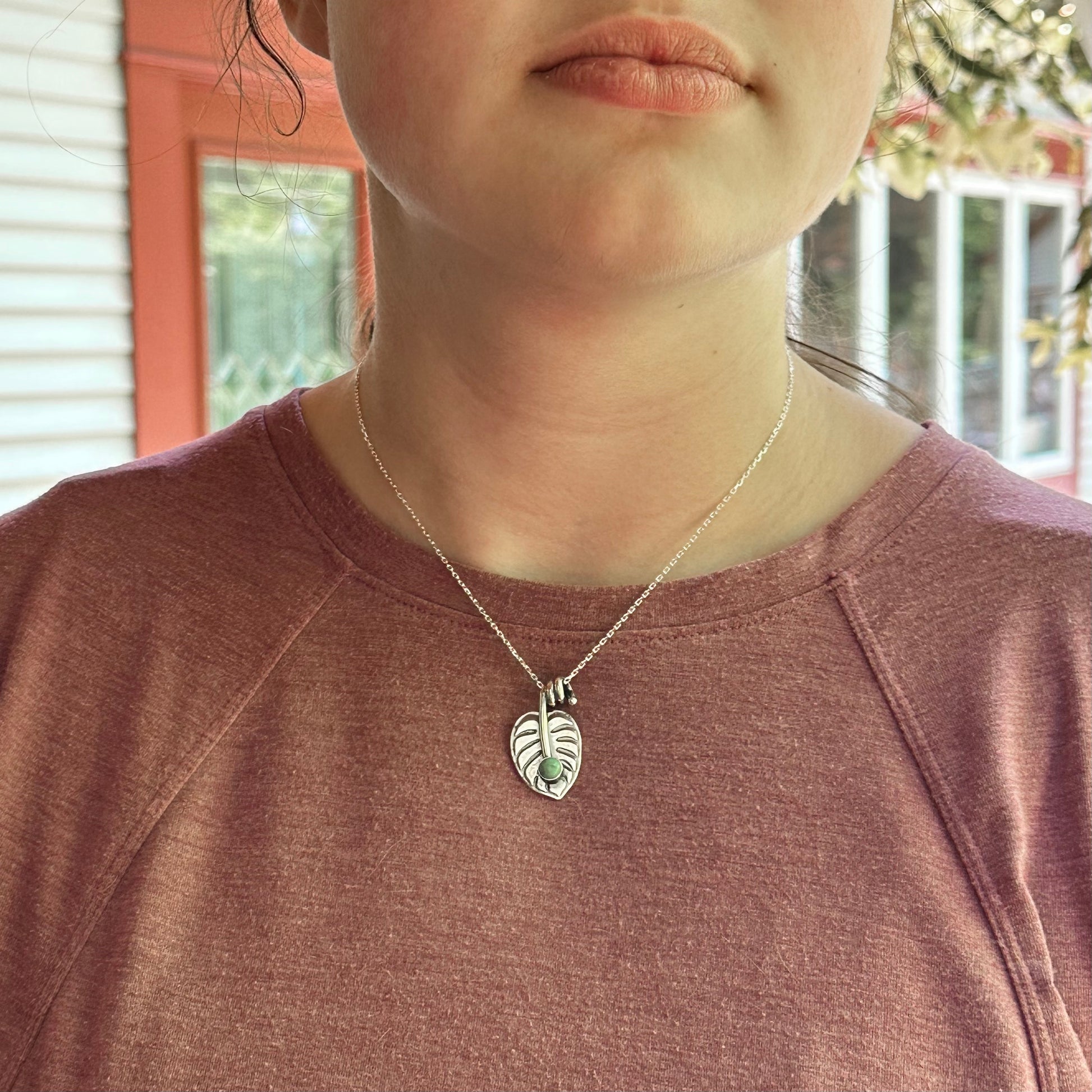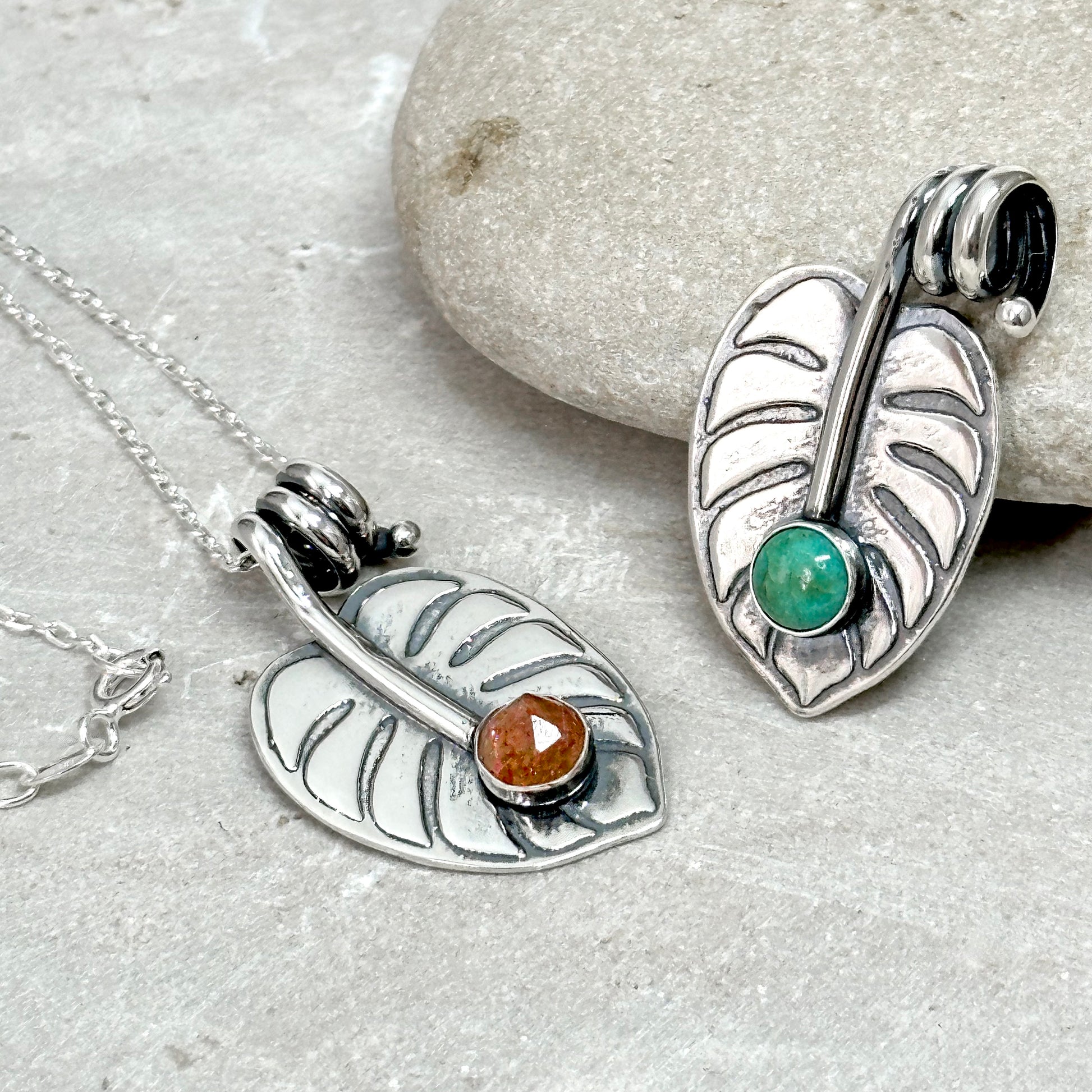 Monstera leaves are so striking, so I had to make a monstera leaf necklace! First, I make an impression of the leaf in the metal before cutting it out and soldering on the bail and setting. I then polish the pendant and set the stone--I set your choice of 6mm (about 1/4") gemstones on the necklace, including moonstone, labradorite, amethyst, chrysoprase, lapis, garnet, opal, and black onyx. Some stones are faceted and some are round - see stone guide for accurate representations. Makes a great gift for mom, or the gardener, botanist and plant lover in your life!