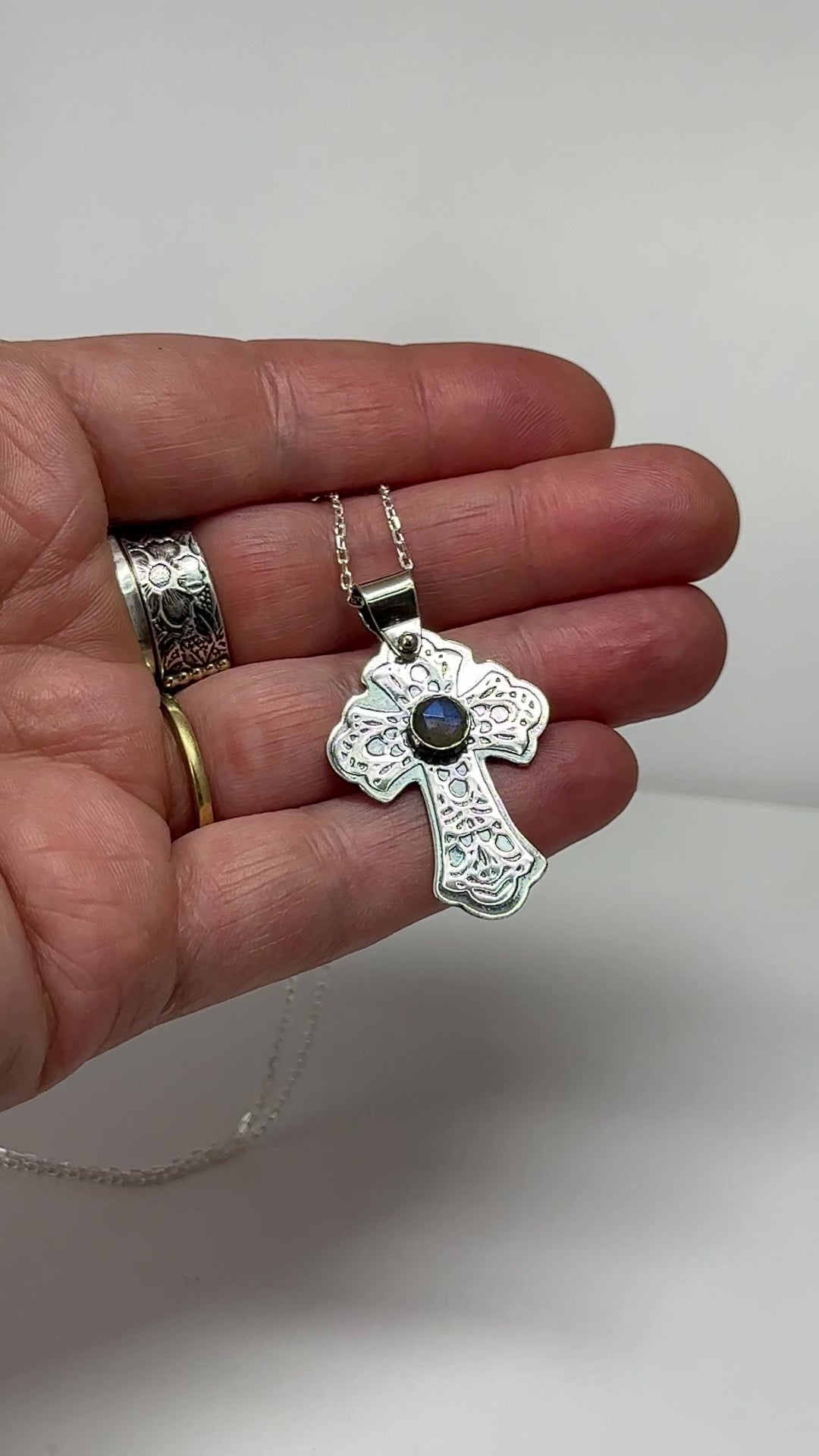 My cross necklace comes impressed with a beautiful pattern and is set with your choice of 6mm (1/4") gem stone. I make the pendant with a pinned, moveable bail for a little extra movement. Makes a great religious or confirmation gift, or buy for yourself to show your faith!