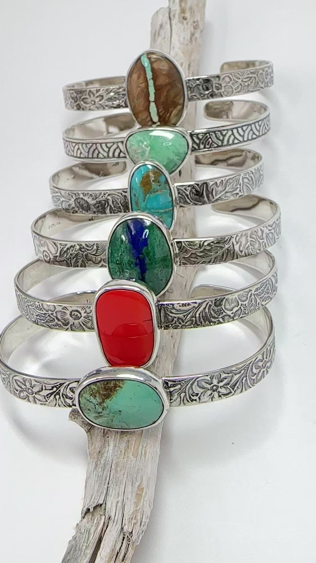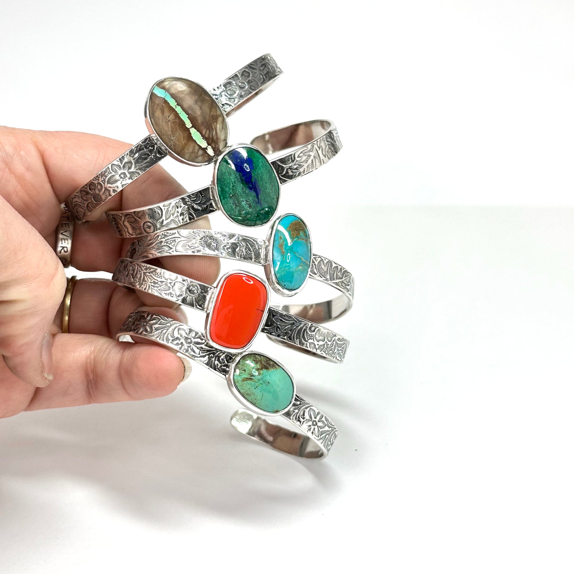 Patterned Cuff Bracelets with Turquoise, Rosarita, Variscite, and Azurite in Sterling Silver