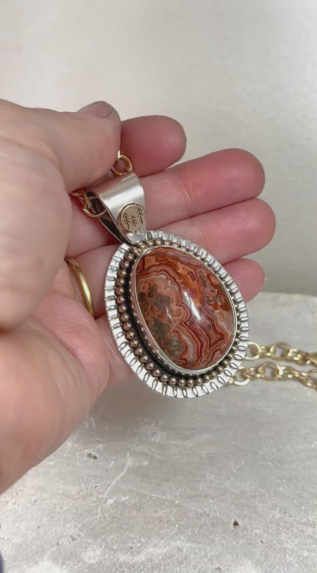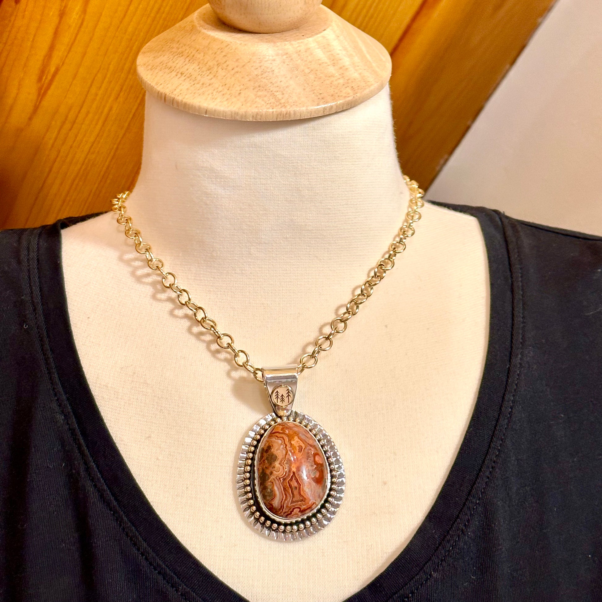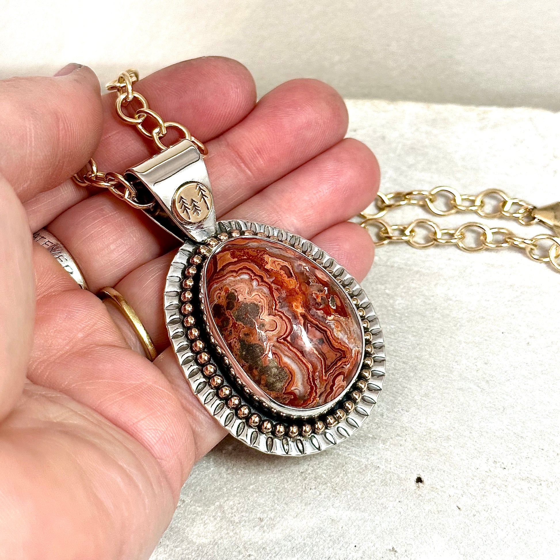 Make a statement with my eye-catching Chunky Lake Superior Agate Necklace! This unique handmade piece features a stunning Lake Superior agate, which I surrounded with fine silver and mounted on Argentium (tarnish resistant) silver, and decorated with 14kt gold fill accents. The adjustable 18" chain is made with heavy 14kt gold fill, so it'll last a lifetime.
